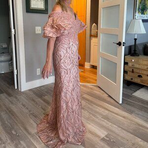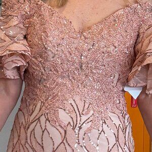 Beautiful Lara mermaid rose gold gown with off-shoulder sleeves featuring a unique tiered cape sleeve. This gown is perfect for any member of the bride's family, from the mother of the bride to a sister. It features a back zipper, polyester lace on polyester lining, and beaded details throughout. 100% polyester. Never worn with tags. Purchased from Macy's and couldn't return it.