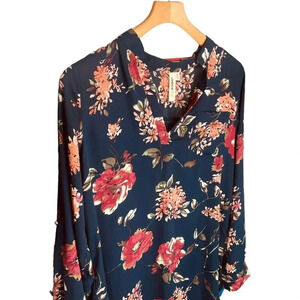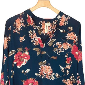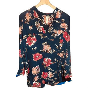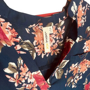 Lara Women's Navy & Floral Print Long Sleeve Blouse. Size M. Features navy shell, floral print throughout, v neckline, long sleeves, cuffed with button closure, pocket at chest, 100% polyester. EUC / excellent used condition.