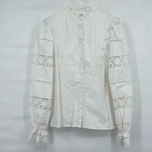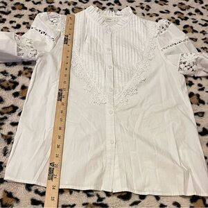 Lara white cotton embellished lace ruffle puff sleeve button up blouse