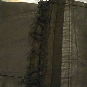 Zipper and button closure at front; belt loops