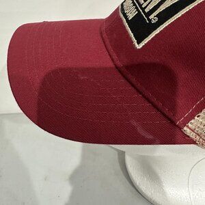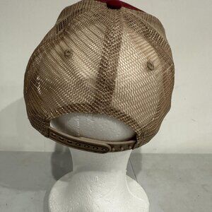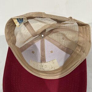 Colors: Burgundy/Red front panels and brim; Tan/Beige mesh back and snap