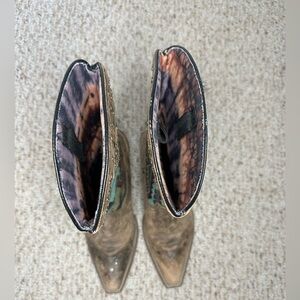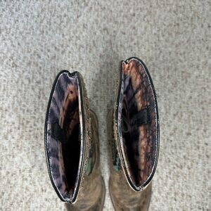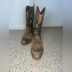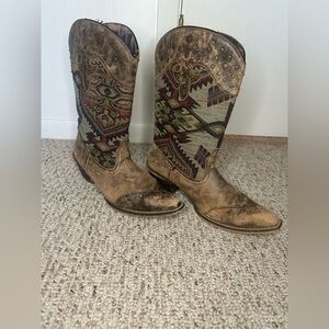 Brand Color: Black/Tan Goat with Aztec Tribal design. Material: Leather. Measurements: Shaft height is 8.75 inches, circumference is 14 inches, and heel height is 2.25 inches. Width: Medium. Perfect cowgirl boots. Please see all flaws on pictures.