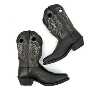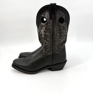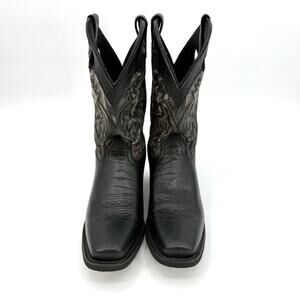 The Laredo Men's Size 12 EW Kane Square Toe Western Cowboy Boots in Distressed Black are a stylish and versatile choice for various occasions. These mid-calf boots feature a square toe shape and pull-on closure for easy wear. Made from leather with embroidered accents, these boots are designed for comfort with cushioned features. The distressed black color and Western cowboy style make them a perfect option for travel, weddings, parties, casual outings, formal events, workwear, and business settings, adding a touch of personality to any outfit.