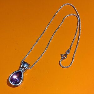 Large 1” Amethyst Teardrop Pendant Sterling Silver Necklace 16" Rope Chain. Amethyst Pendant measures approximately 1” long, fairly thick - some weight to it. It is stamped inside. Approximately 16” Rope Sterling Silver Chain with Spring Ring Clasp. Gift Box included.