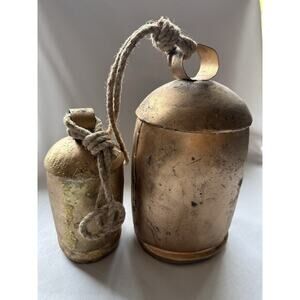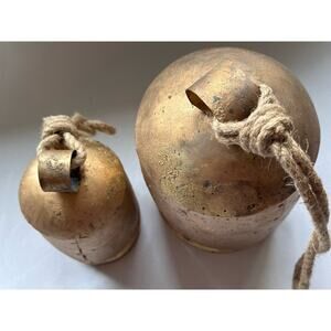 This product is a set of 2 handmade metal cow bells in a rustic country style. The larger bell measures 11 inches in height and the medium bell measures 8 inches. Both bells have a metallic finish and are adorned in a country rustic pattern. Perfect for any occasion, these decorative collectibles bring a touch of charm and character to any space.