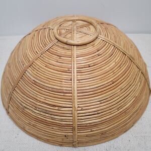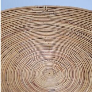 Nice oversized mid century, 1970s coiled reed bowl - basket. Large vintage reed rattan bowl, in the style of Crespini. hand crafted natural finish shallow bowl on base. The perfect fruit, vegetable, hat and glove catch all or storage bowl