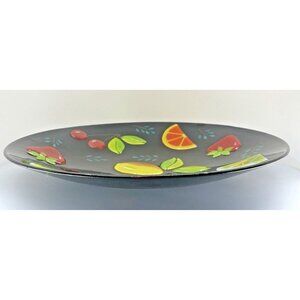 This large 16" round platter features a beautiful & vibrant cut fruit design on a black background, created using fused glass production techniques. A beautiful citrus, strawberry and cherry motif lift off of a black background, making it a perfect addition to any dining experience in need of a pop of color. The result is a unique and eye-catching piece that is sure to impress. Crafted from high-quality glass, this shallow bowl is perfect for both casual and formal occasions.