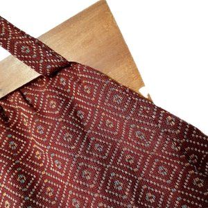 A large 1940s vintage knitting tote bag or purse in deep brick red fabric with a deco design.