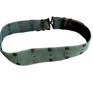 This vintage military-style canvas web belt is a timeless piece with its robust brass buckle and eyelets. A piece of history that offers both functionality and a touch of classic military fashion, making it a cherished addition to any collection or wardrobe ensemble, evoking the nostalgia of bygone eras.