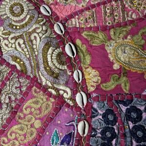 This large 30" floor cushion cover throw pillow in pink color with a patchwork Indian bohemian design is a perfect addition to any room. Made from 100% cotton with embroidered features, this round cushion cover exudes a bohemian and Art Deco style. The intricate cloud pattern and floral garden theme make it suitable for adults who appreciate art, yoga, and Moroccan aesthetics. Made in India, this cushion cover adds a touch of all might character to any space with its unique design and vibrant colors.