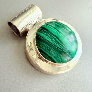 Valued for thousands of years as a gemstone, this Malachite pendant has a substantial piece of round cut Malachite at approximately 44.89 CT. Gorgeous define vertical zoning of the rhythmic layers formed as malachite precipitates over time in copper-rich environments . Large slide bale opening, ready to hang on your favorite necklace or cord. Pendant is approximately 1.75" x 1.5"