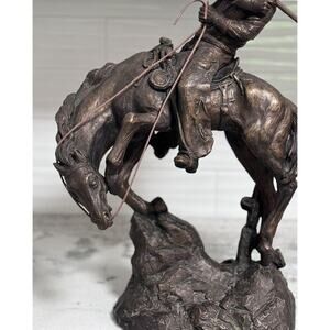 Antique style bronze/metal sculpture American cowboy with rifle riding horse. Measures 21 inches tall by 14 inches across at its widest point. Base measures approximately 10.5 inches by 8 inches. Huge beautifully made & heavy piece! Weighs almost 25 pounds. Signed near base. No noticeable flaws. Rifle does detach out of his hand. (#888)