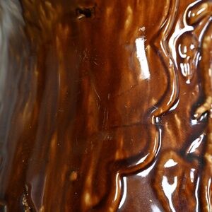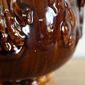 There are some defects from manufacturing, with a number of bumpy pieces under the glaze, as well as a drip above the angel on one side. There are some scratches under the neck and on some of the wider points of the bowl. There is a large chip on one side of the lip, as well as some smaller chips on the bottom, and there is a very fine crack on the edge of the spout. Please review close-up photos.