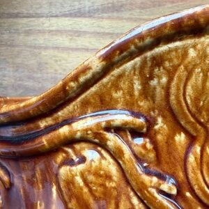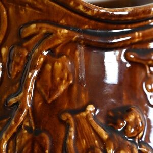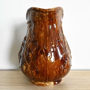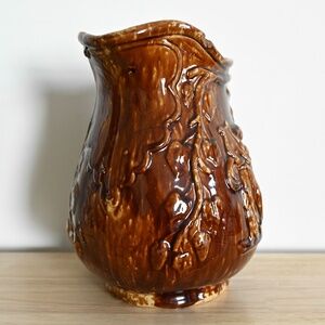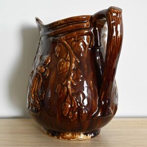 Large antique Rockingham glazed pitcher, featuring a raised design of an angel playing a harp, framed by large leaves on suspended branches. Comfortably holds 13 cups (104 oz). This has been tested for leaks and none were found.