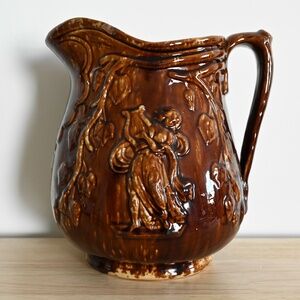 Large Antique Rockingham Pottery Pitcher w/ Angel Playing Harp
