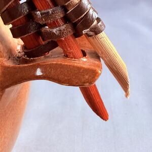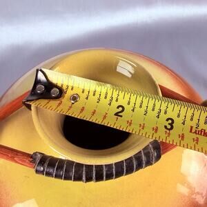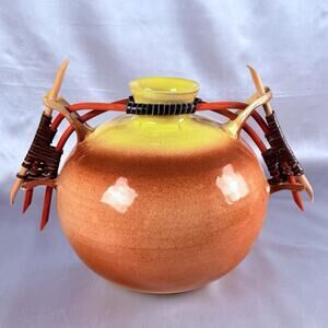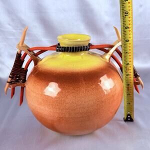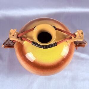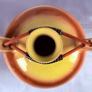 Large Art Pottery Vase Southwest Style MCM Yellow Orange Wood Handles 11” Signed
