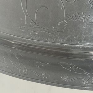 The product is a large 24" x 12.5" aluminum handled tray featuring a whimsical bunny rabbit design, manufactured by Arthur Court in 1980. The tray is made of silver aluminum, making it a durable and stylish serving piece for any kitchen or home decor. With its vintage charm and unique design, this tray is sure to add a touch of nostalgia and elegance to any holiday or special occasion.