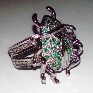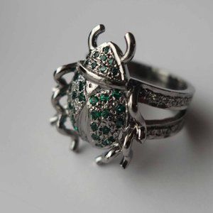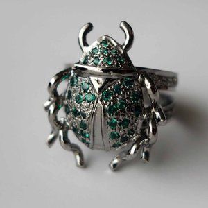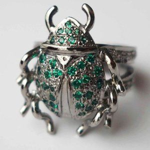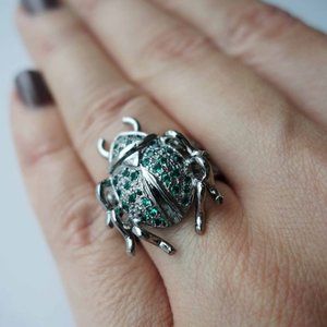 Large Beetle Natural Emeralds Diamonds Sterling Silver Cocktail Ring