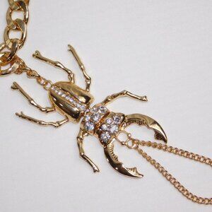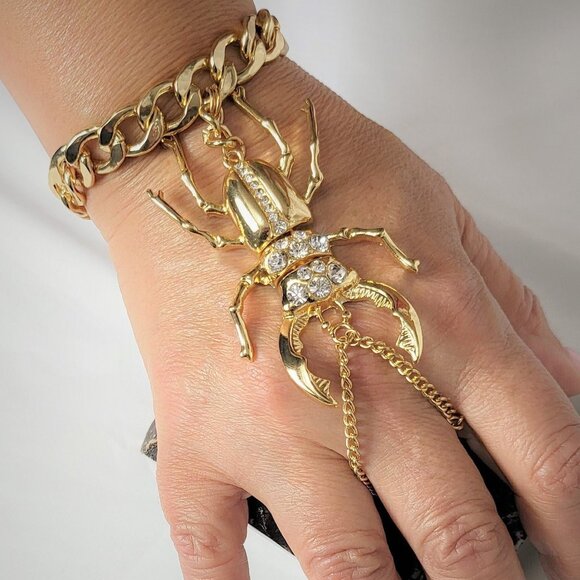 LONG HORNED BEETLE W. RHINESTONE GOLD TONE BRACELET AND RING SET