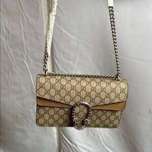 Stylish shoulder bag with iconic green and red stripe. Beige pattern with black accents. Perfect for any occasion. Good size.