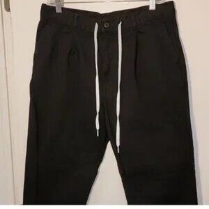 JOHN ELLIOTT NWT Elevate your style with these premium USA-made chinos in black khakis, thoughtfully cropped at a 3.5” inseam—perfect for a relaxed yet refined look, often referred to as jog pants. Featuring an authentic John Elliott shoe lace tie-up design, these chinos offer a sleek, tailored fit with a waist measurement of approximately 36”, ensuring comfort and sophistication in every step.