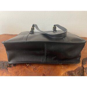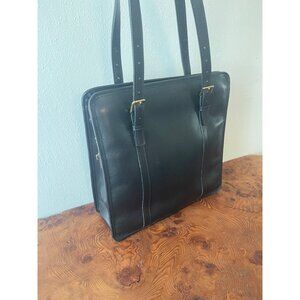 This large black leather tote would be perfect for travel, art or in lieu of a briefcase. Genuine Leather with gold color metal accents. Double zippered top closure with Jack George's gold key accent. Two adjustable leather straps. The inside has 3 large openings with the middle opening zippered closer and the two side openings without zippers.