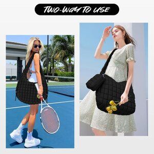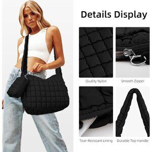 Large Black Nylon Quilted Oversized Tote Bag with Pouch — The ultimate in utility and style! This puffy tote measures 18.8 by 15.7 by 5.9 inches, with a handy small pouch size of 7.87 by 5.9 by 1.96 inches. It’s super roomy, perfect for carrying your phone, wallet, tablet, laptop, water bottle, umbrella, makeup, clothes, and more, making your busy days so much easier!