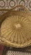 Beautiful large blonde colored wicker woven basket with a unique rim border that vaguely looks like a star, sunburst, or flower from above.