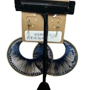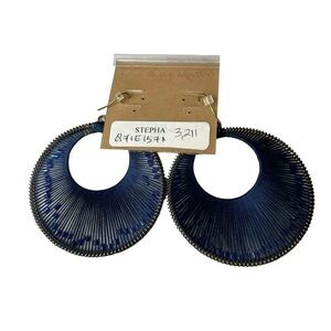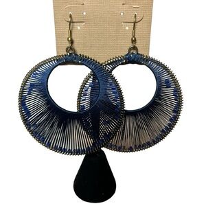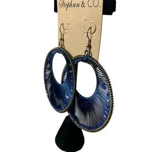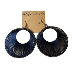 Stephan & Co. large circular woven blue string hoops with blue crystal beads within. Beads are able to move within the woven string. Brass metal color base. Hook back piercing. 2 1/2” in diameter. A fun statement piece to add to your accessories that is so on trend this year!