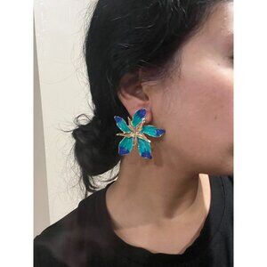 Large Blue earring Flower turquoise sea green royal blue gold oversized Earrings