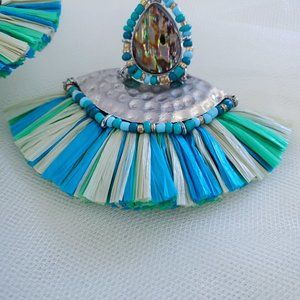 Cool colors faux Raphia skirt in a triangle shape dropping of a silver tone earring piece which dangle off a teardrop shaped abalone shell sitting on a bezel, adorned with cool shades of seed beads.
