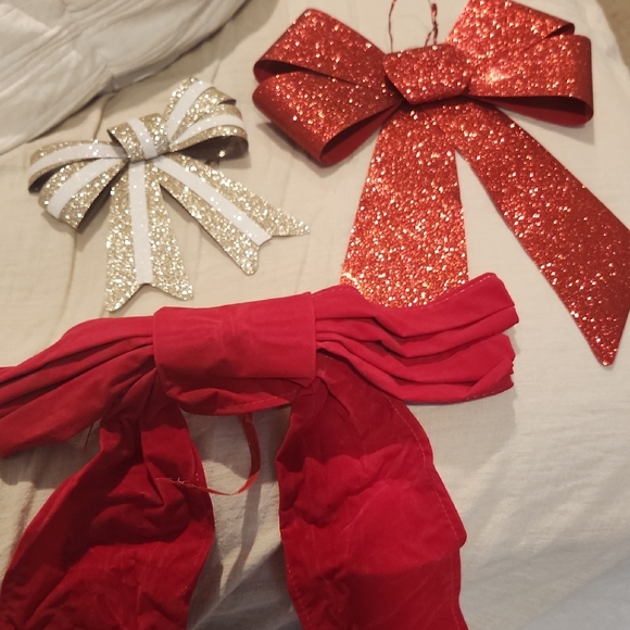 3 bows to add to any gift 1 large sparkly 1 large plain red 1 medium white and gold each have hooks to add to a gift
