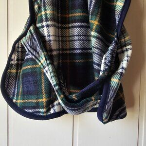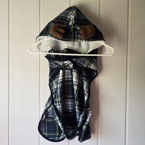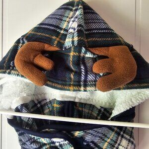 Large Breed Dog Moose Pajamas with Antlers, Green plaid for dogs to wear. These have the hook and loop closure on them to go around the neck and under their belly. These are Christmas type jammies for your large dog. This item is like brand new. We purchased for our lab who was having no part of having that thing on him! So it never got used! Cute moose antlers on the hood of it and green/white/ gold plaid for the holidays. Perfect for dressing up your dog for family Christmas photos!!