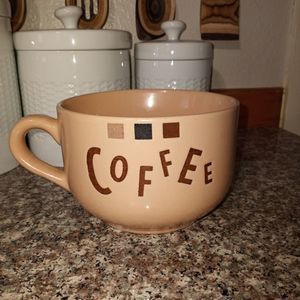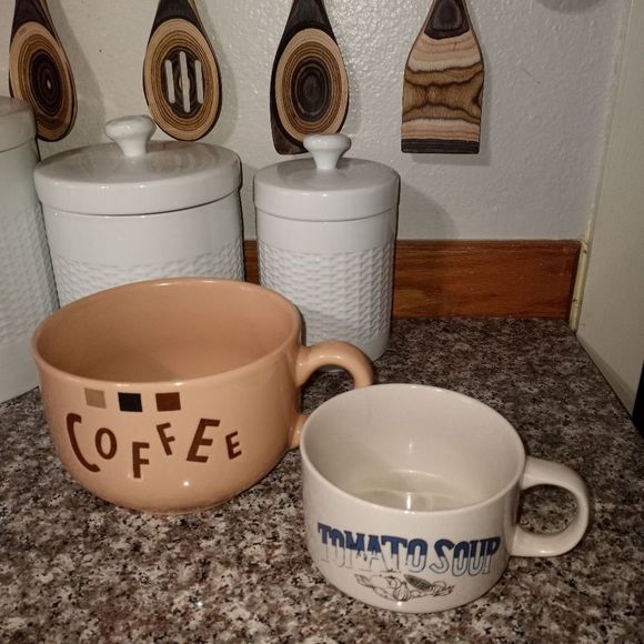 This large coffee cup is very unique and much larger than your standard coffee mug. See photo. The tomato soup bowl is even smaller than this coffee mug. Tomato soup bowl is included with purchase of this brown large coffee mug. It has some normal stains in the inside from coffee.