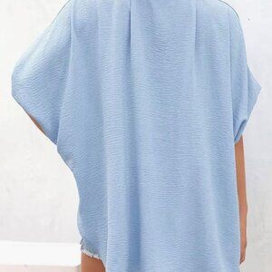 Solid Color, Hidden Button Down Front Closures, Short Sleeves, Drop Shoulder, V Neck, Turn Down Collar, Oversized Fit, High-Low Style, Loose Fit Shirts