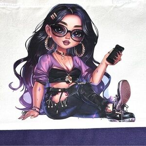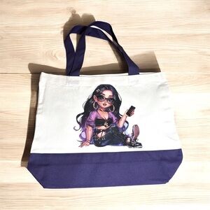 Make a bold statement with this fashion-forward canvas tote featuring a hand-pressed print of a stylish girl in purple and black. A trendy and practical bag for everyday use, errands, or gifting.
