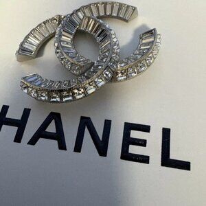 Add timeless elegance to any outfit with this authentic Chanel Crystal Bijoux Coco Brooch. Measuring approximately 2 inches, it features the iconic interlocking CC logo adorned with sparkling crystals, perfect for elevating jackets, blazers, scarves, or bags.