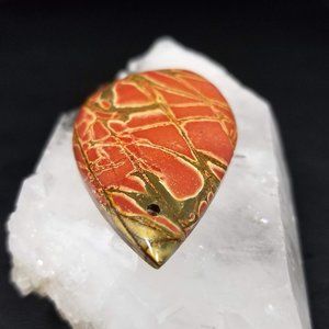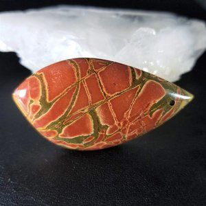 This beautiful Cherry Creek Jasper has awesome coloration and wonderful patterns. Most Cherry Creek Jasper is known for this type of rich red and green coloring. This will not disappoint. It is drilled, front to back, near the top. The domed front rolls gently over to meet the angled edges of the flat back, there is no girdle. Both faces are polished. It measures 51.04 x 27.85 x 6.81mm.