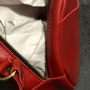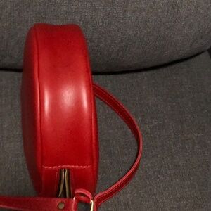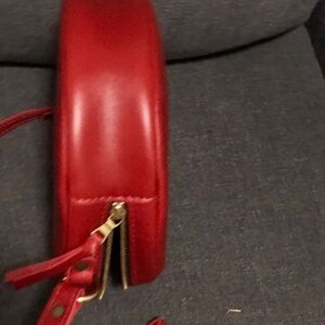 Beautiful large circle crossbody bag in the discontinued color ruby. It is preowned in like new condition. The inside is an unlined suede finish. It has a large outside pocket that wood be great for your phone or keys. The leather texture is smooth not pebbled and it has a large inside pocket as well. This bag comes from a smoke free home. The hardware is brass. The brand is Portland Leather Goods. This bags original retail price was $250.00.
