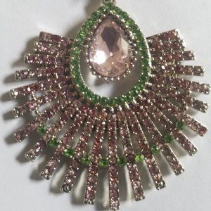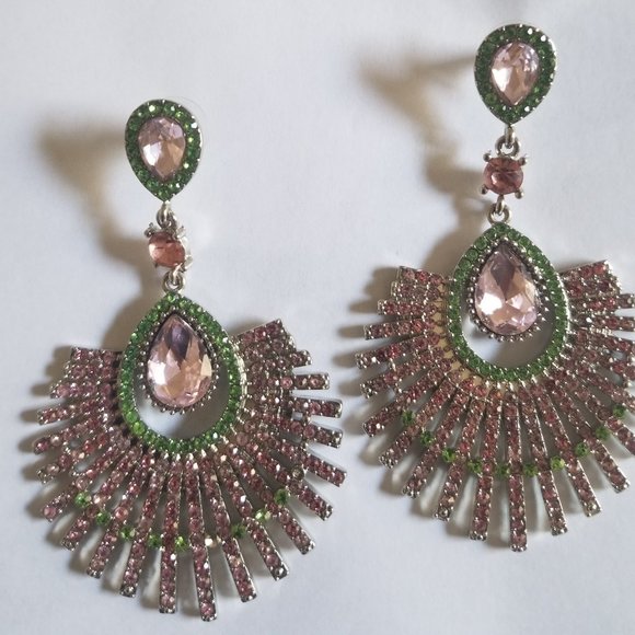 Gorgeous Silver Stud Teardrop Earrings with Green and Pink Chrystal Earrings