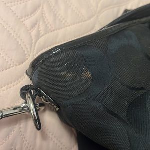 Black on black classic Coach pattern with a silver inside there are three pockets inside and one of them is a zipper pocket. Outside also has one zipper pocket - perfect for easily getting to your cell phone.