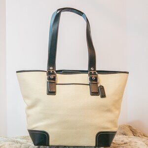 Large Coach Hampton Woven Ivory Straw and Black/Blue Leather Tote Bag B04K-4469