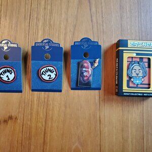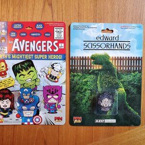 An assortment of collectible pins: eight in packaging and eighteen loose for a total of twenty six. Of the packaged ones. there are two Lord of the Pins (Laserlas and Cyb-Orc), three Universal Studios, one Archer, One Avengers Captain America and one Edward Scissorhands. Of the loose ones most are Loot Crate, two are Firefly, and one is unlabeled. Would make a great addition to a teachers reward basket.