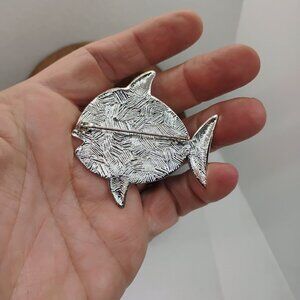 Once upon a time, in the depths of an enchanted ocean, there lived a fish of extraordinary beauty. Captured in silver and adorned with emerald and azure scales, this brooch brings a touch of whimsical storytelling to your attire. It gleams with the charm of ancient tales, ready to adorn any ensemble with its playful elegance.
