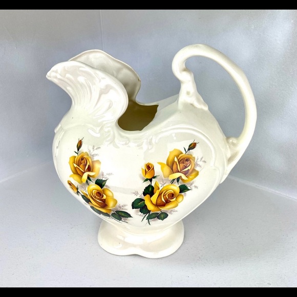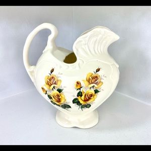 This ornate ceramic pitcher is designed in a Victorian style with yellow rose design on both of the heart shaped sides of the pitcher. This piece has an off-white glaze finish which brings out the stunning yellow color of the roses. "Cramer Mold 248" is incised on the bottom. Cramer is the company who made the 1970s molds for the ceramic light-up Christmas trees.