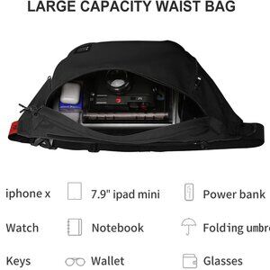 Large and Small Size Fanny Pack The dimension of the Large size fanny pack is about 22.05"* 6.30" *7.87",the capacity is huge.The dimension of the Small size fanny is about 18.5"* 7.48" *2.36".The zipper main compartment can easily hold iPad,kindle, power bank, wallet, mobile phone, 13 inch folding umbrella,standard size bottles of water.And two front zipper pockets let you easily access and carry your small gear. The internal zipper pocket and back zippered pocket is great to store smartphone, money, credit cards and other valuables.
