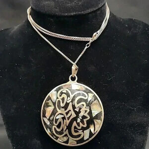 pendant is 2 1/4" wide, marked Mexico on the bale. Chain is a 30" box chain marked .925 A-7