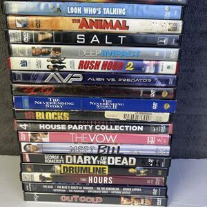 This large DVD lot of 105 movies includes a variety of genres such as horror, comedy, drama, workout, and action. The movies come in NTSC format with a tall/DVD case packaging, featuring actors like Adam Sandler, Tom Hanks, and Tom Cruise. The special edition and limited edition DVDs from 20th Century Fox include additional scenes and are presented in both full screen and widescreen formats, suitable for viewers in regions with DVD Region Code 1 (US, Canada). Subtitles are available in English, French, and Spanish, making it an extensive collection for movie enthusiasts.