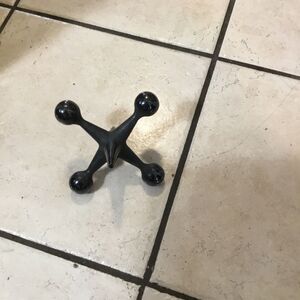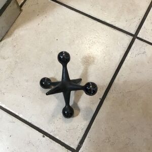 This is a large black decorative cast iron toy jack that can be used as a doorstop, paperweight, or bookend. Made of metal, it adds a unique and functional touch to any space. It is not handmade and its country/region of manufacture is unknown.