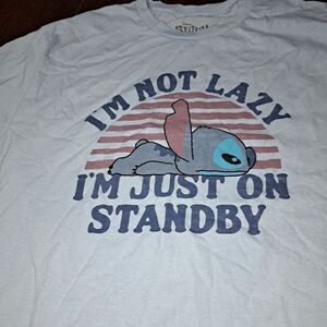 Good Used Condition Unisex Size Large Disney Stitch Cotton Short Sleeve Crew Neck Pullover Tee T-shirt Top "I'm Not Lazy I'm Just on Standby" Blue with Grey, Brick Red, and Black